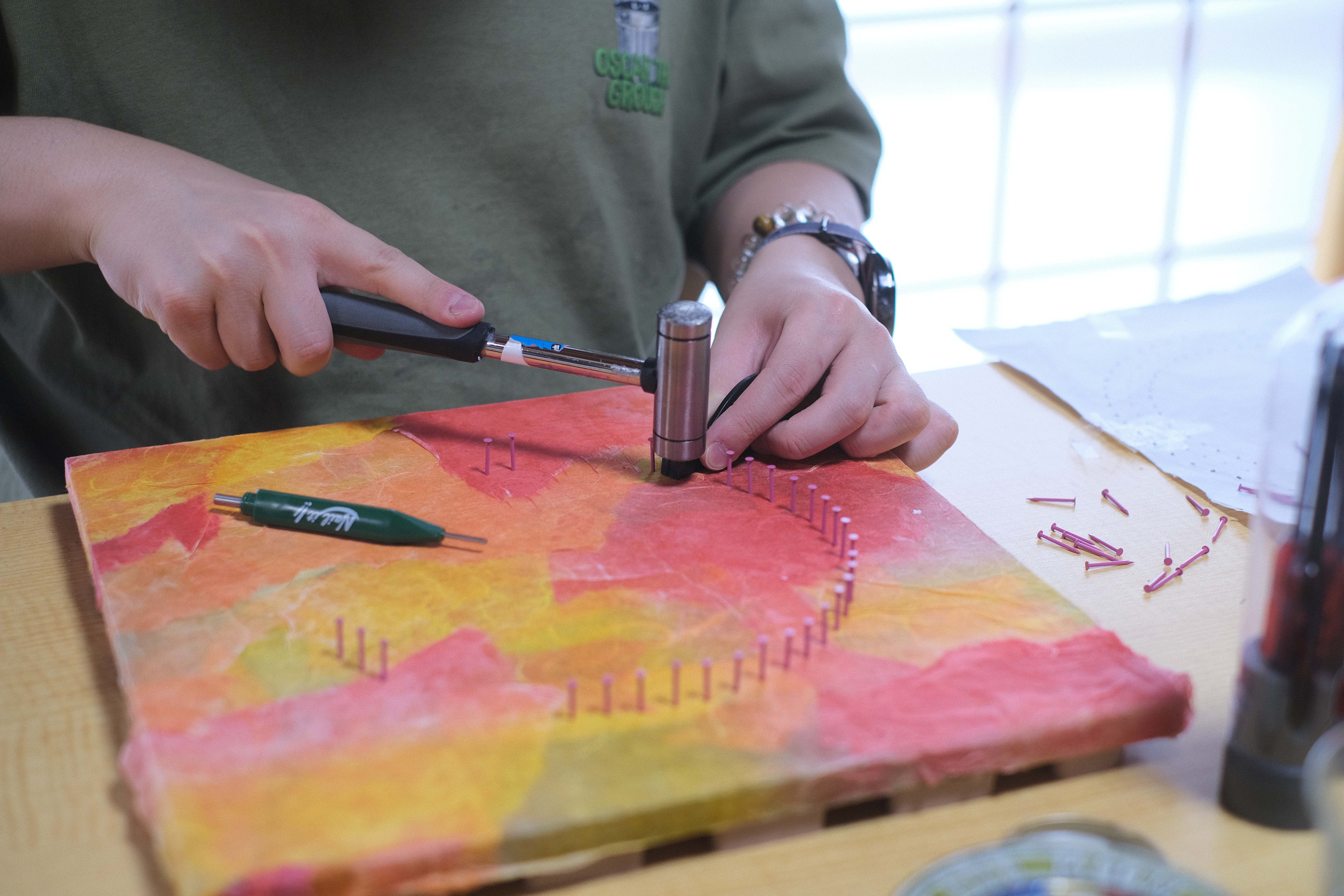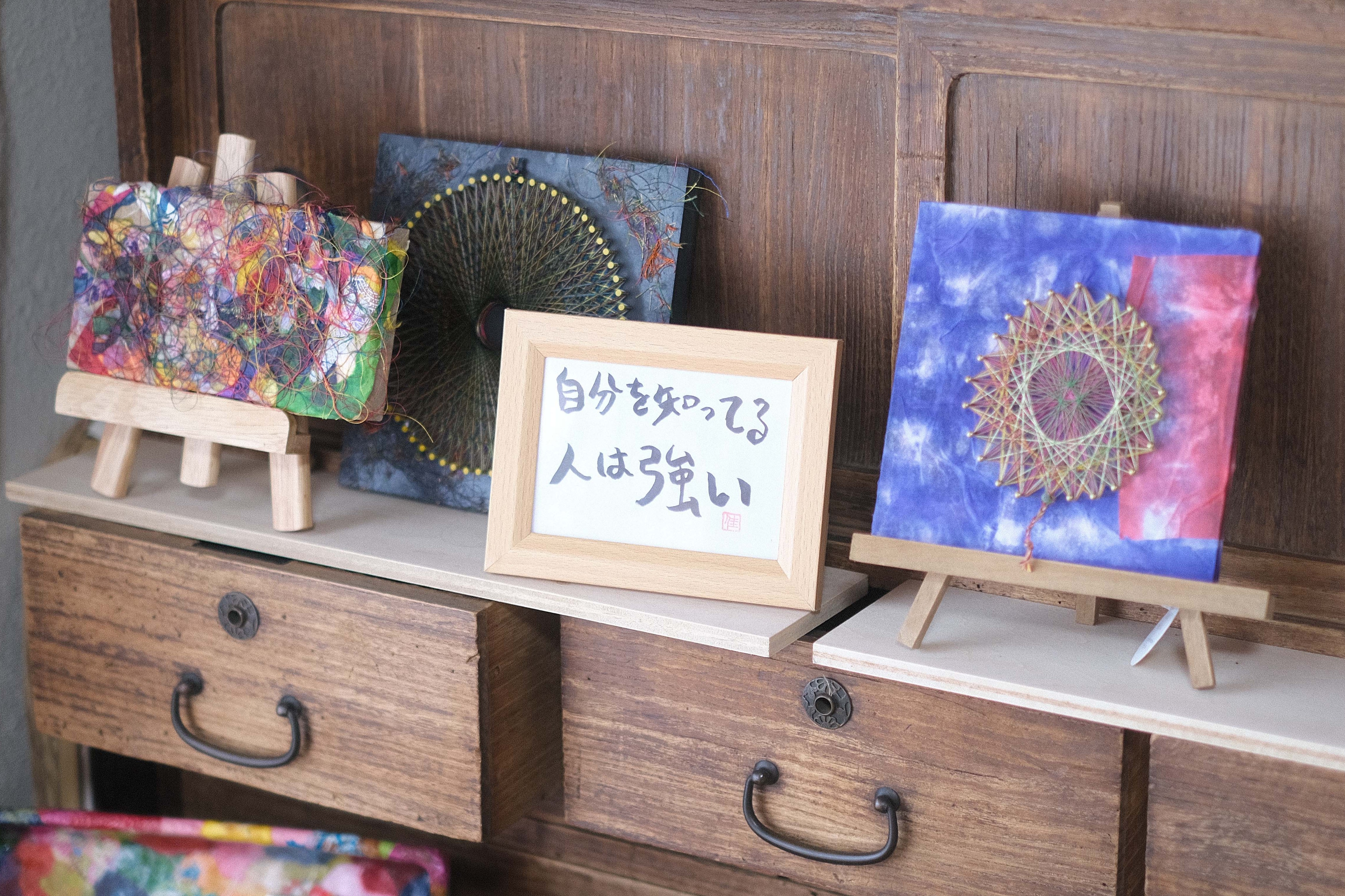 創作活動のきっかけは、中村さんが糸掛曼荼羅の作品に出会ったことでした。 糸を一本一本掛けていく作業は、「集中力やこだわりの強さを持つ利用者ならできるかもしれない」と始めてみたところ、職員も驚くほどの表現力が次々と生まれました。 始めは、職員と一緒に作り指示があれば作業をする方も、自分の作品が売れたことをきっかけに「次はこれを作りたい」とアイディアを語るようになったり、時には「職人になる」と口にするほど、創作に熱中するようになりました。