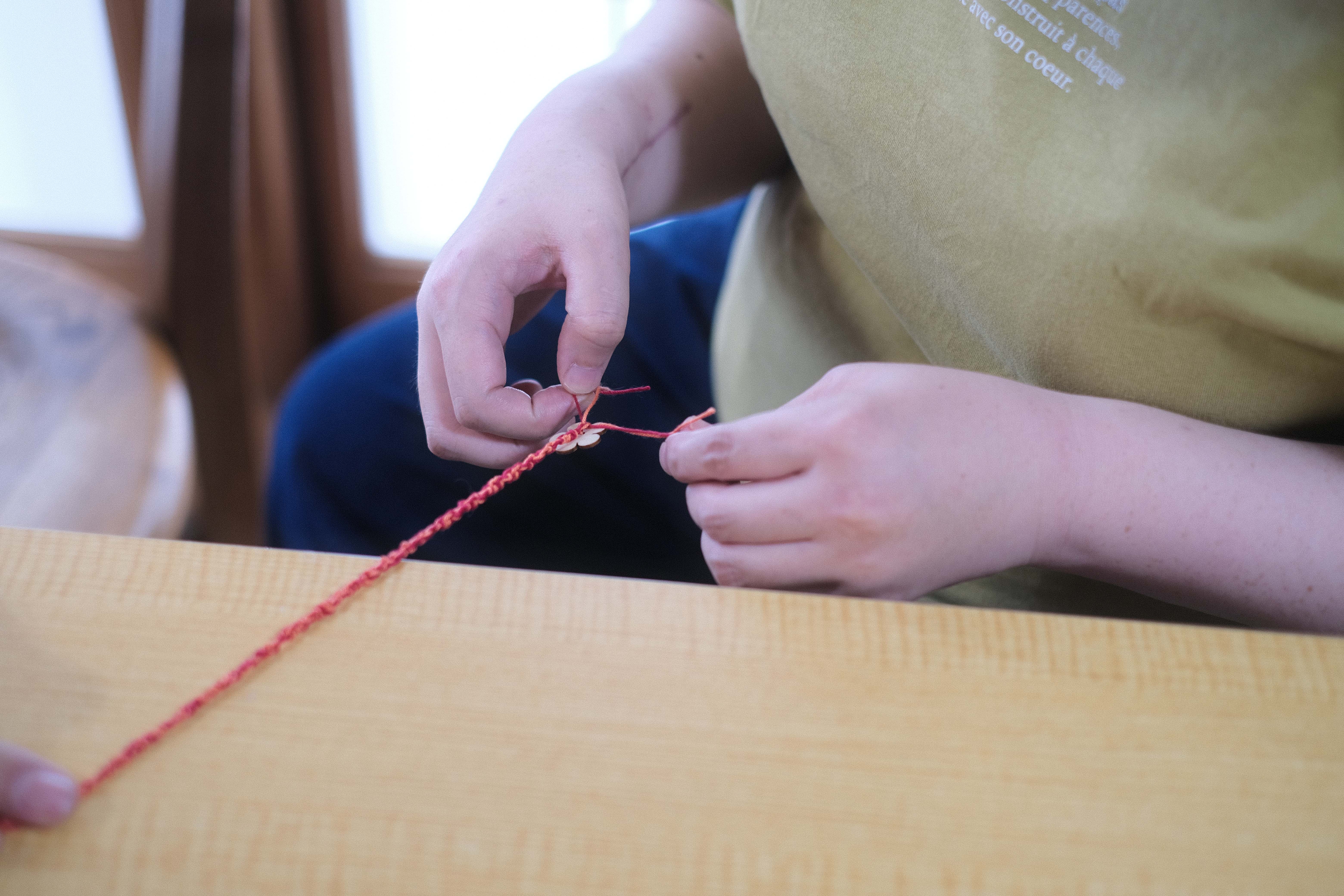 ミサンガを編む利用者さんの作業風景